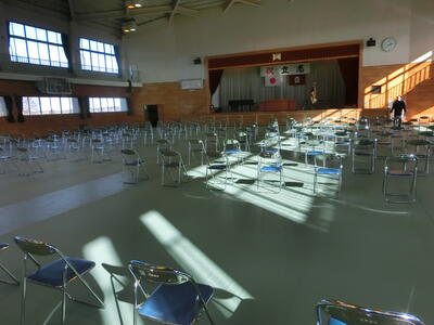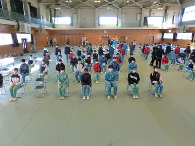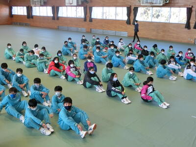 1・2年生のみのため、体育館にて行いました。(ソーシャルディスタンスをとっています)