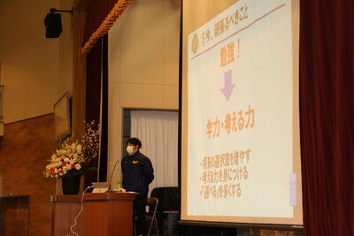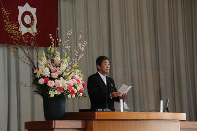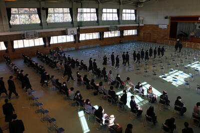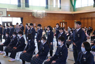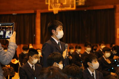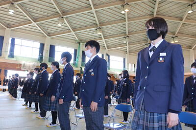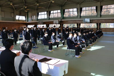 4日(木)、多くの保護者に見守られる中、2年生131名が「立志」を迎えました。今年は感染症対策のため、1・3年生は教室からリモート視聴でした。