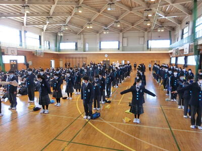 1・2年生のみのため、体育館にて行いました。(ソーシャルディスタンスをとっています)