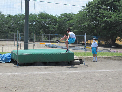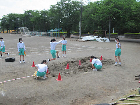 体育の授業では、青空のもと、男子は高跳び、女子は幅跳びの練習に励んでいました。