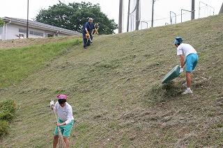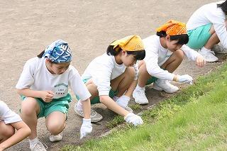 校庭の石拾い。ケガの防止には絶対に必要な作業です。