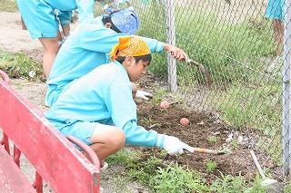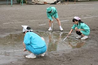 校庭の石拾い。石は、転んだとき思わぬケガの原因になります。
