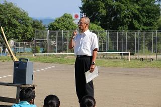 出張中の校長に代わり教頭先生が講評を行いました。4分13秒で避難完了。