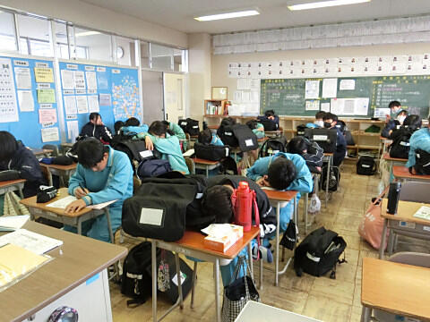 帰りの会の様子をお伝えします。まず、一日の反省をするために黙想します。