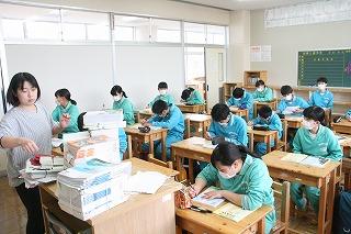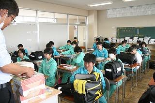 どのクラスも教科書を配っていました。今日のカバンは重そー!