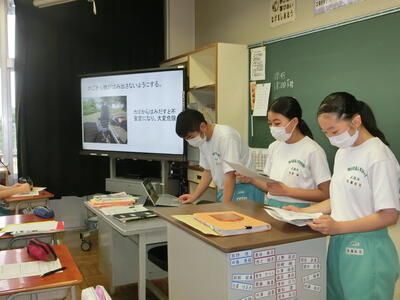 29日(水)帰りの会終了後、交通委員会による「交通安全指導」が行われました。各学級にてアンケートを行ったり、交通委員が担当職員の作成した映像やプレゼンテーション画面を活用して交通ルールや命の大切さを丁寧に説明したりしました。