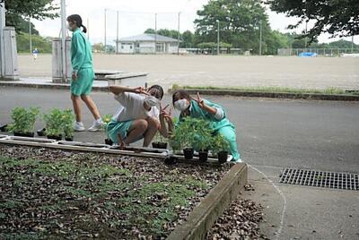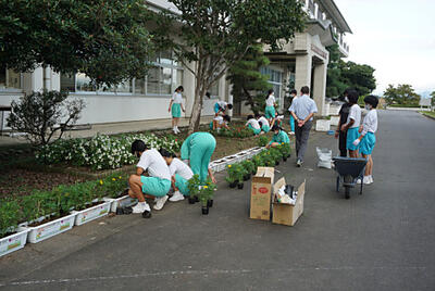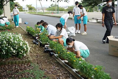 代表の選手を花で応援する運動を行っています。本日、生徒たちが花を植えてくれました。