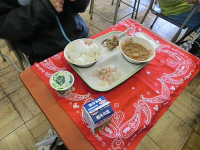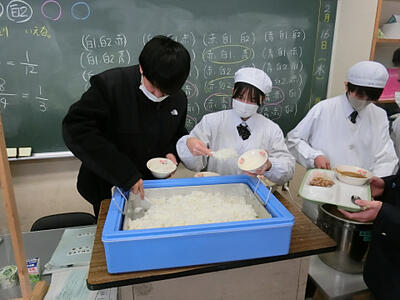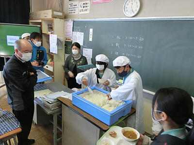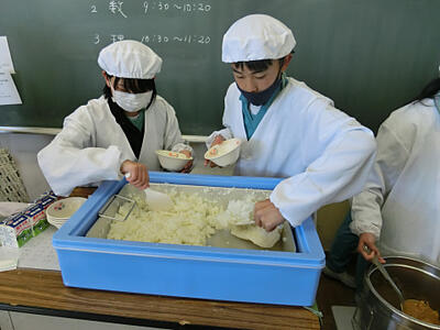 本日の給食時、2年1組と2年2組で米飯給食配膳調査が行われました。