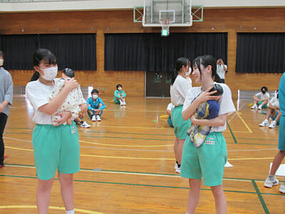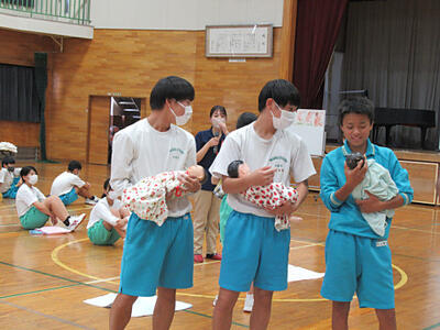 また、赤ちゃん抱っこ体験も行いました。首のすわっていない赤ちゃんの抱き方や、げっぷの出させ方などを実習しました。実習を行った生徒には笑顔が見られました。