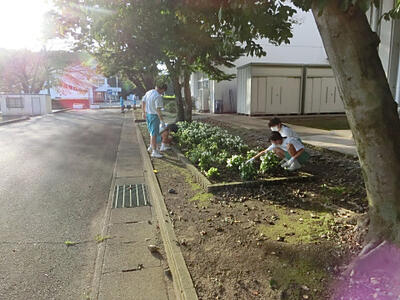 写真は環境委員の活動の様子です。先週の委員会で草むしりを行い、本日は花植えをしました。
