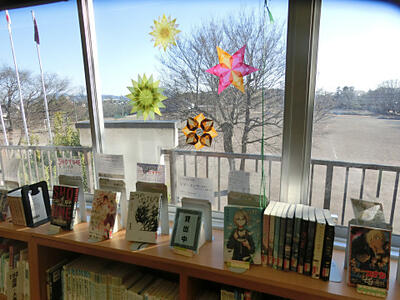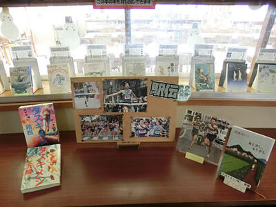 図書室の前には駅伝に関する本が並んでいます。司書さんが見出しを作り、本を選んでくれました。