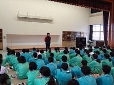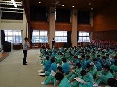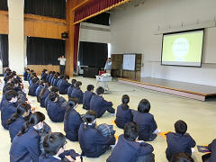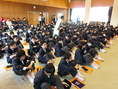 12日、全校生を対象に、交通安全教室を開きました。講師として、真岡警察署職員の方に