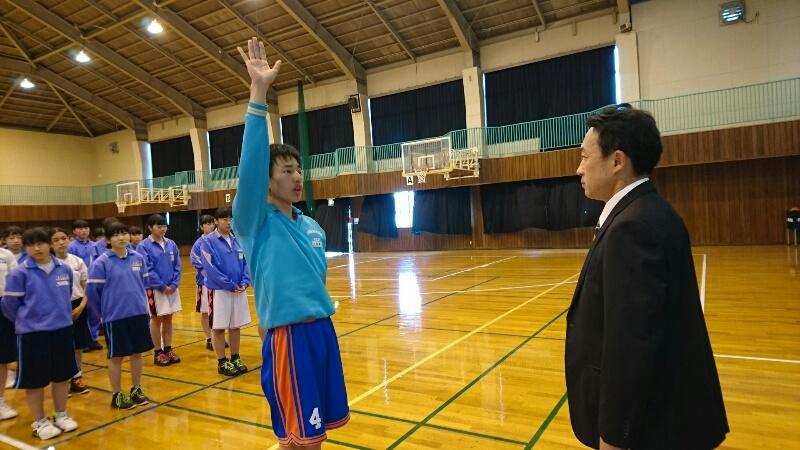 春季大会が始まりました。写真はバスケットボール大会で選手宣誓をする、山崎勇人君です。