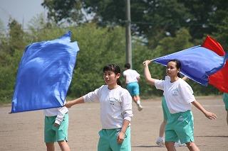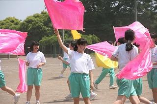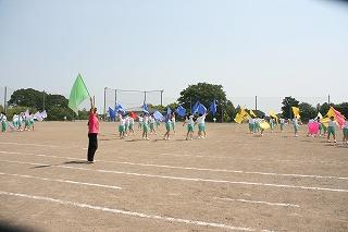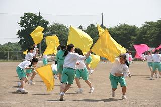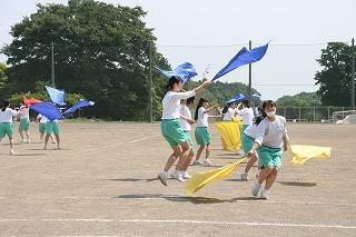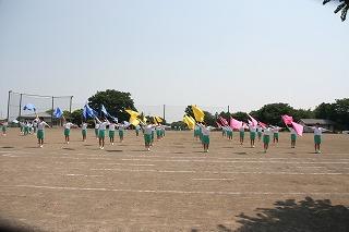 クラスごとに色分けされた旗を持ってダンスの練習が始まりました。