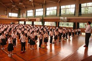 整列した1,2年生のみなさん。夏の日差しが容赦なく照りつけます。