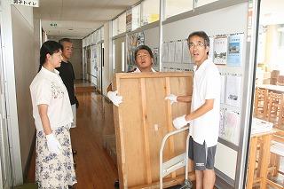 電子黒板の導入で、撤去される「教壇」。(添谷先生の表情がヘン!)