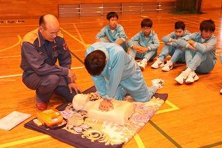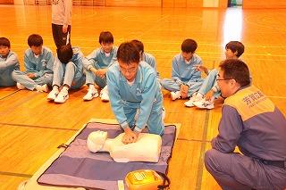 3,4校時に行われた「応急処置法実習」。3校時は男子が実施。(2年生)