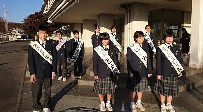 「たすき」をかけ、あいさつ運動で存在感をアピール。(全員写せてなくてすみません。)