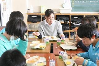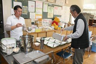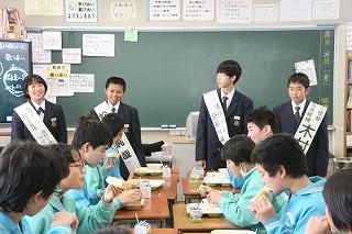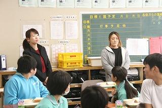 給食センターのみなさんが来校。配膳や給食の様子を参観しました。
