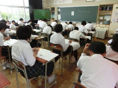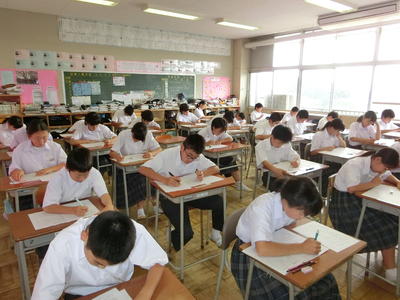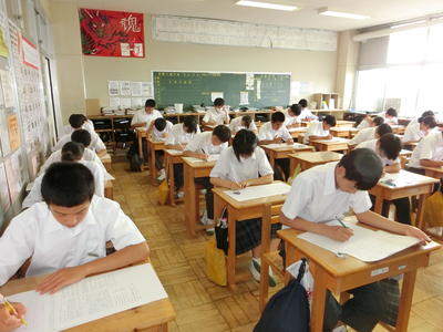 各学年とも、テスト問題と真剣に向き合っていました。前夜、たくさん勉強したのか目をこすりながらテストに取り組む生徒もいました。明日も1~3校時に3教科が予定されています。今夜も学習に励むことと思います。ご家庭での励ましやご支援、よろしくお願いします。