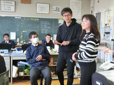 職員室では着任のあいさつ後、早速新年度の打ち合わせが始まりました。新型コロナウィルス感染症拡散防止の措置で多くの行事計画の見直しが必要になり、細部に渡り協議を進めています。