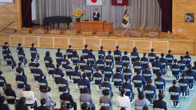 例年とは異なり、在校生や来賓の皆様の臨席は無く、職員と保護者の皆様に見守られての入学式。堂々とした態度での入場、はつらつとした返事、やる気に満ちた表情に、職員一同、新入生の今後の中学校生活がとても楽しみです。