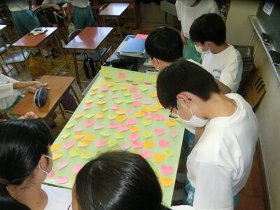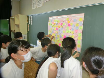 17日(水)1年生の学級活動の時間に、「他喜力コーナー」を作りました。これは、お互いの「良いところ」「感謝の気持ち」を言葉に書いて掲示します。自分の何気ない行動が周囲を元気にさせていること、友人から感謝の気持ちを言葉で表してもらうことは生徒自身にとってうれしいことです。どんなことが書かれているのか、気になるようで書かれた付箋を食い入るように見ていました。