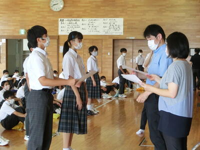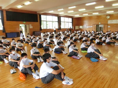 元気な顔で登校した生徒たち。まだまだ残暑厳しいですが、暑さに負けず学習に運動に励みましょう。放送による校長先生の講話を聞いた後、学級委員の任命も行いました。