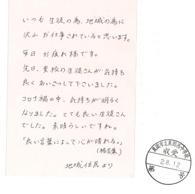 夏休み中、地域の方より大変うれしいお便りを頂戴しました。