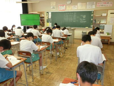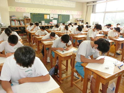 28日(金)3学年すべて、校内実力テストを実施しています。2~6校時にかけて5教科行っています。