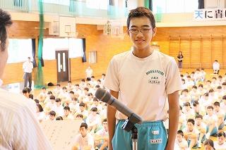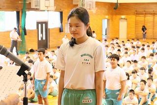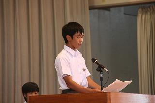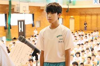 始業式に続いて行われた「学級委員任命式」。1年生代表の阿久津 匠君。