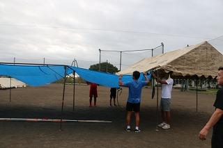 入場門付近に設置した「雨よけテント」。高久先生の発案です。