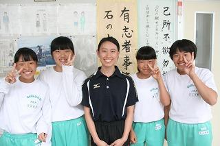 石﨑 千穂先生・保健体育担当(2年生のみなさんと教室の前で。)