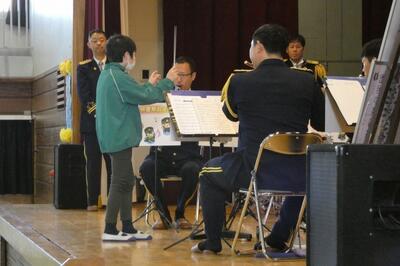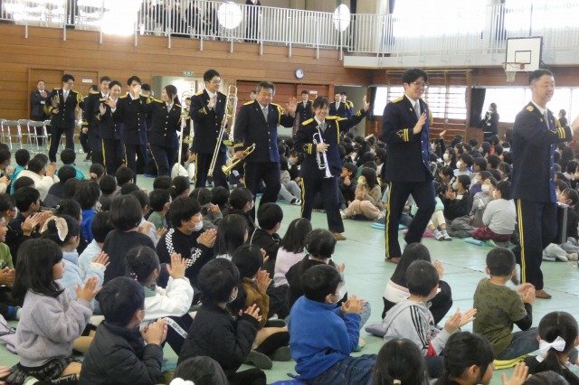 音楽隊の皆さんが入場。歓迎の拍手でお迎えする子供たちです。「カッコイー!!」