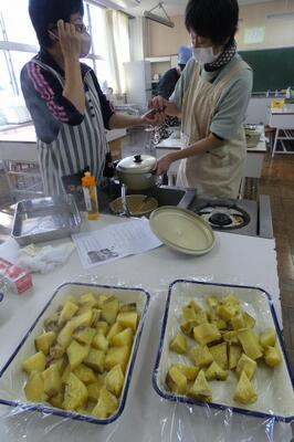 ボランティアさんが、家庭科室でサツマイモの皮をむいて小さく切ってお鍋で蒸かしてくださいました。