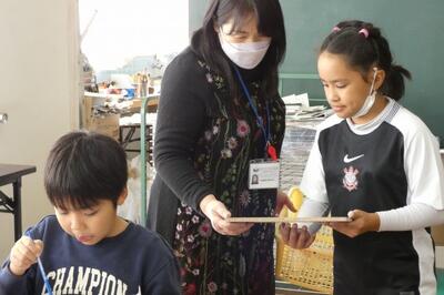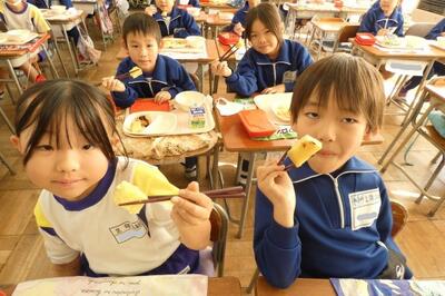 先日2年生がサツマイモを収穫しました。今日の給食の時間に、そのサツマイモをみんなで試食しました。