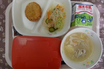 今日の給食は、アジカツ・ソース、春雨サラダ、どさんこ汁、ごはん、牛乳でした。エネルギー629kcal、たんぱく質20.8g、脂質18.7gでした。ごちそうさまでした。