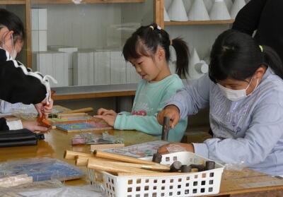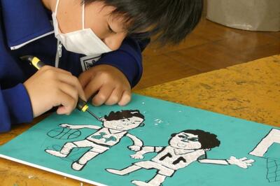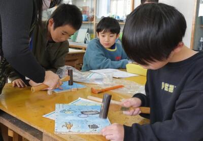子供たちは、好きなスポーツや趣味に取り組んでいる場面、夏休みの思い出、日常生活のワンシーンなどを題材にして構図を考え、彫刻刀で一生懸命に彫り進めていました。