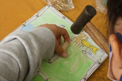 次に、金づちで釘を打ったり、色付き輪ゴムで囲ったりしていました。