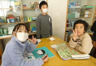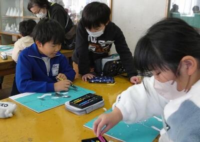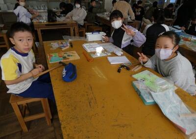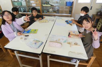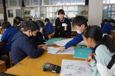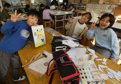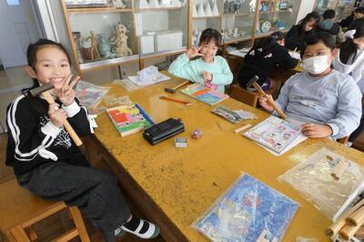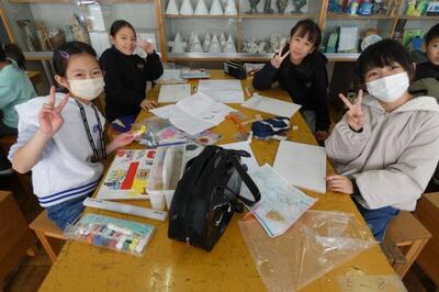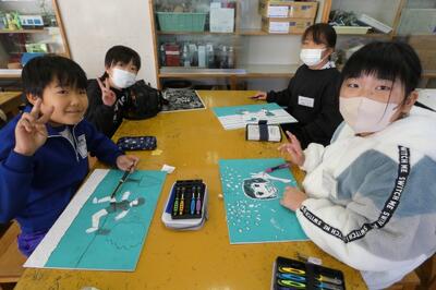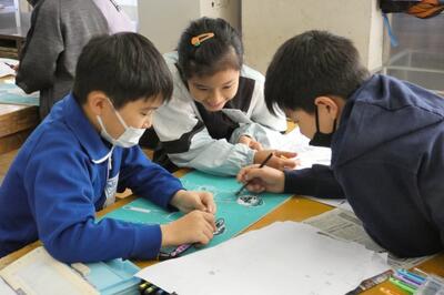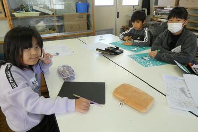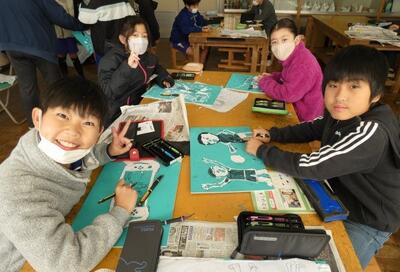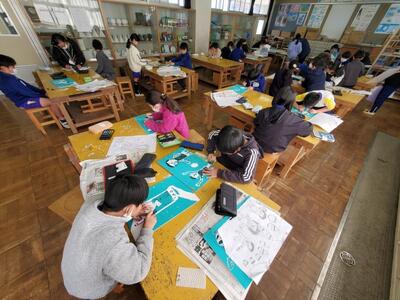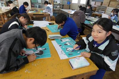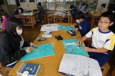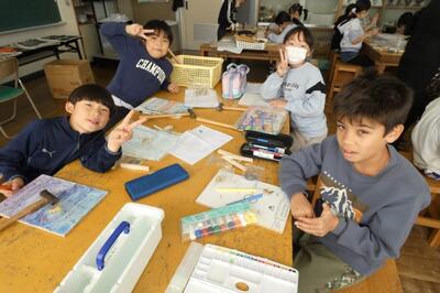 彫り・刷りまで終わってしまった児童は、作品に着色をしていました。