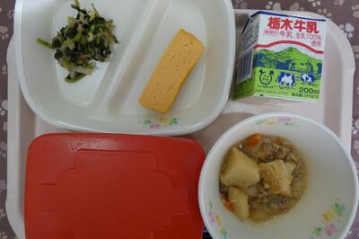 今日の給食は、厚焼き卵、じゃこあえ、ひき肉ごまじゃが、ごはん、牛乳でした。エネルギー655kcal、たんぱく質26.5g、脂質19.5gでした。ごちそうさまでした。