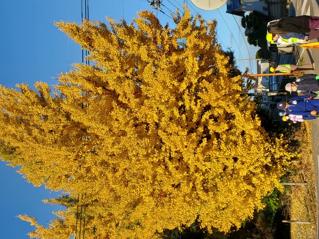 イチョウの葉が金色に輝く時季となりました。高勢町方面から登校してくる子供たちを待っているのは、西高間木の大イチョウとスクールガードの皆さんです。
