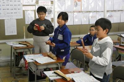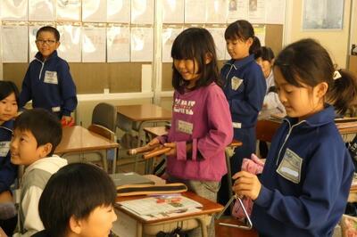 先生が持っているのはクラベスという楽器です。早速「やりたーい!」と子供たち。