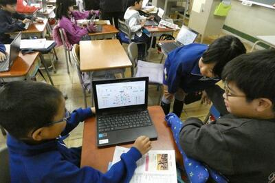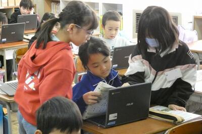 ワイワイタイムで、互いのノートを見比べたり、納得のいかないところの説明を求めて教えてもらったりする子供たち。