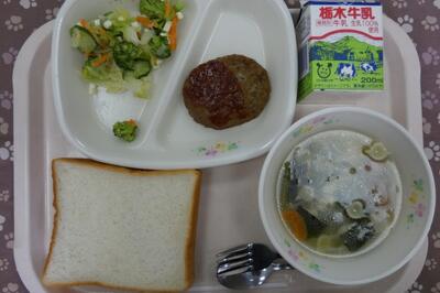 今日の給食は、ハンバーグのケチャップソース、チーズと野菜のサラダ、ウインナーとマカロニのスープ、ミルク食パン、牛乳でした。エネルギー617kcal、たんぱく質26.1g、脂質22.7gでした。ごちそうさまでした。