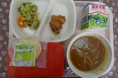 今日は、中村中学校リクエスト給食でした。とりのから揚げ、元気サラダ、カレー、洋梨のタルト、ごはん、牛乳をいただきました。エネルギー807kcal、たんぱく質23.3g、脂質29.8gでした。ごちそうさまでした。