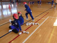 紅白の玉を使いながら、「おにあそび」をしています。次の対戦の前には、チームで作戦会議をしていました。
