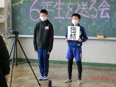 6年生から5年生へのバトンタッチでは、「団結」の文字が受け継がれました。