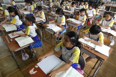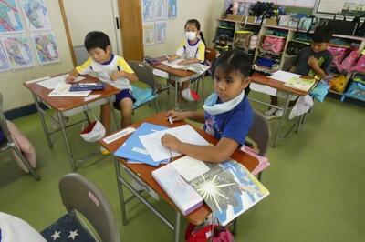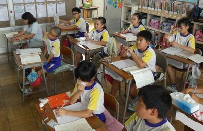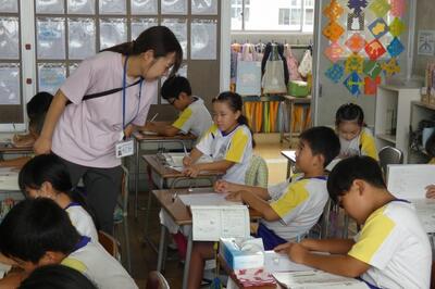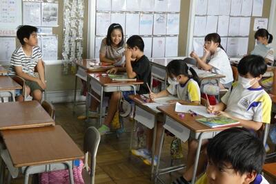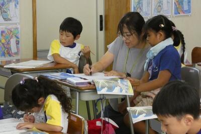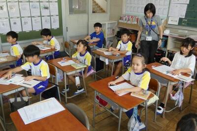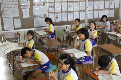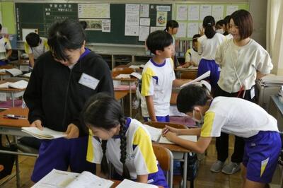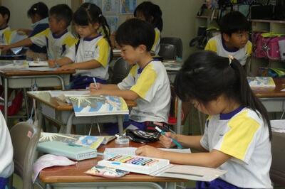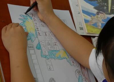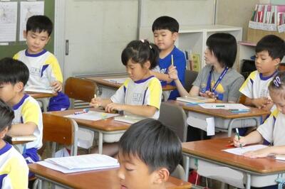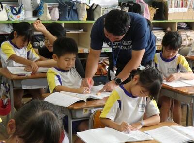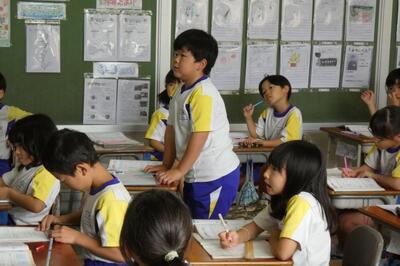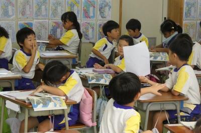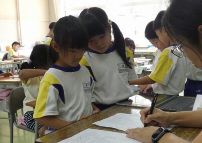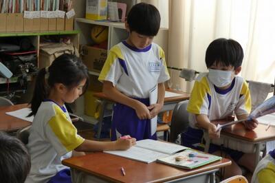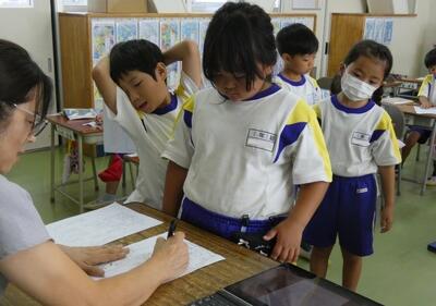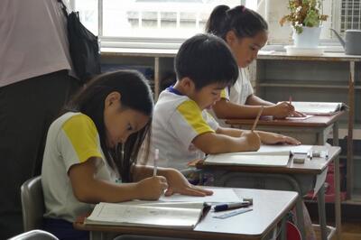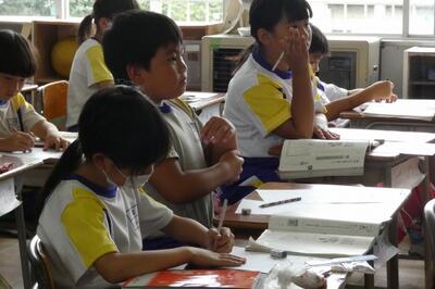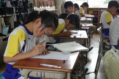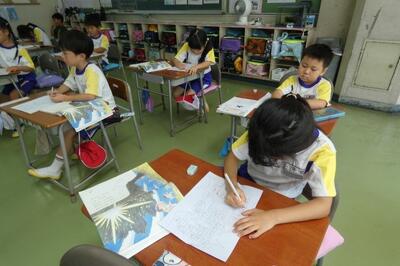 子供たちは、教科書にある手本をもとに、おじいちゃん・おばあちゃんなど、身近な人に宛てる手紙の下書きをしました。