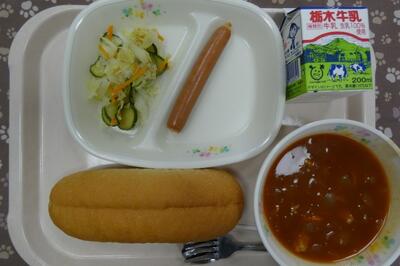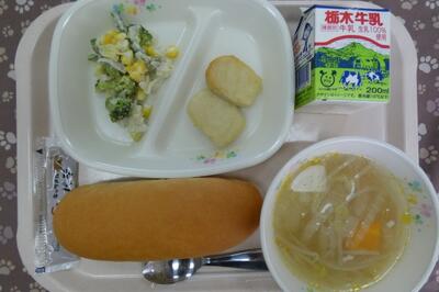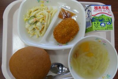 今日の給食は、牛肉コロッケ・ソース、マカロニサラダ、ウインナーと野菜のスープ、丸パン、牛乳でした。エネルギー637kcal、たんぱく質18.8g、脂質23.0gでした。ごちそうさまでした。
